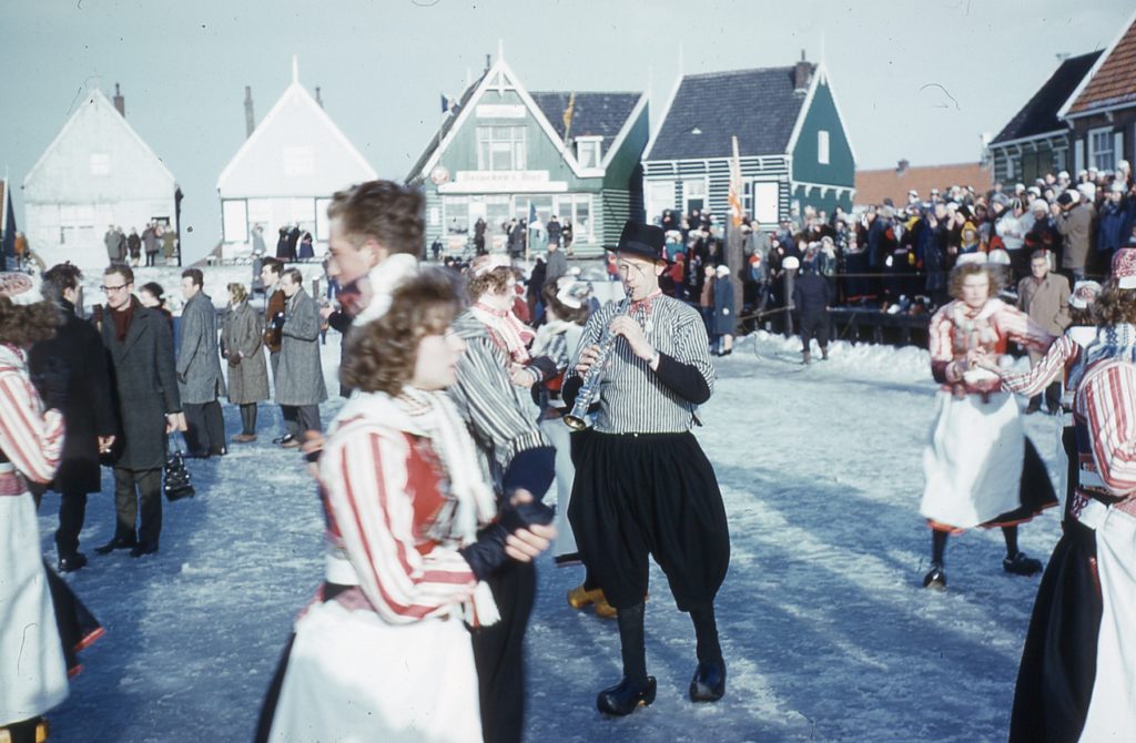 Een collage van foto’s, ansichtkaarten en dia’s – onder andere van Paul Kuiper – met wintertaferelen op Marken.