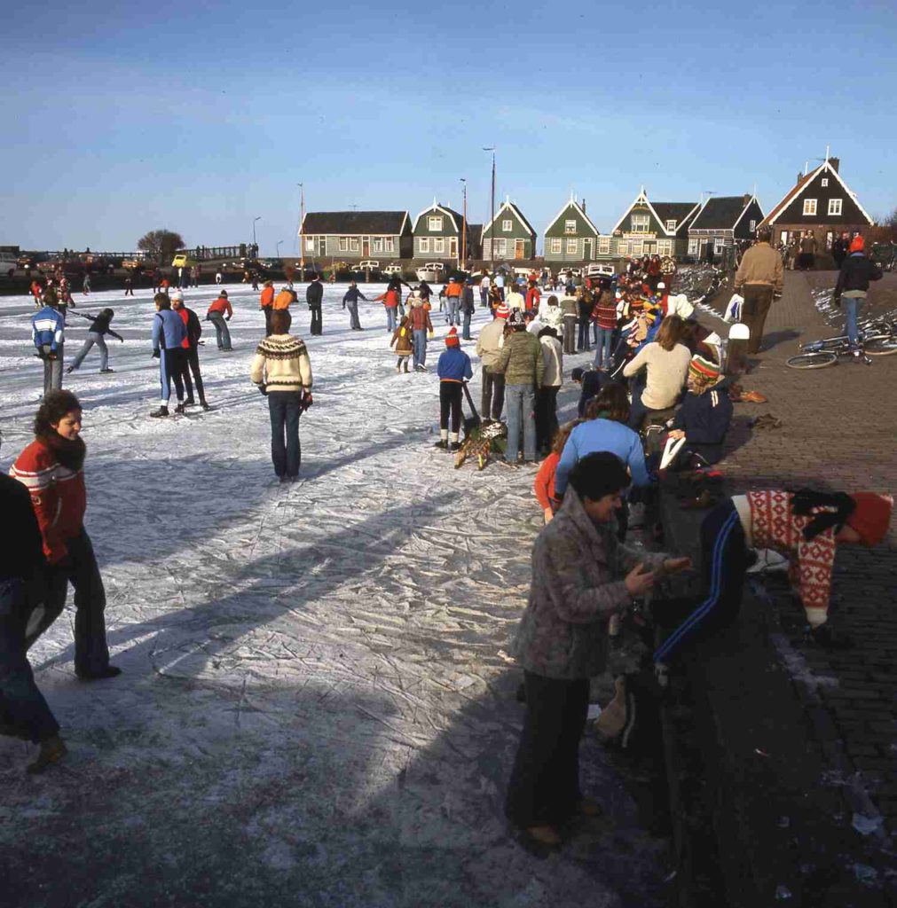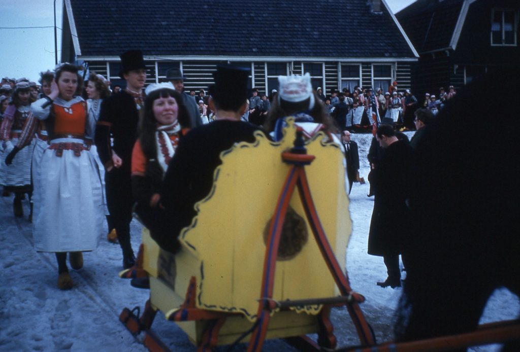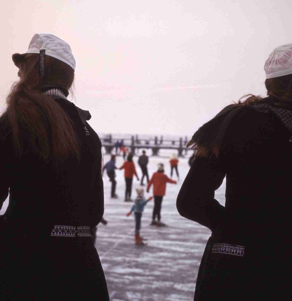 Een collage van foto’s, ansichtkaarten en dia’s – onder andere van Paul Kuiper – met wintertaferelen op Marken.